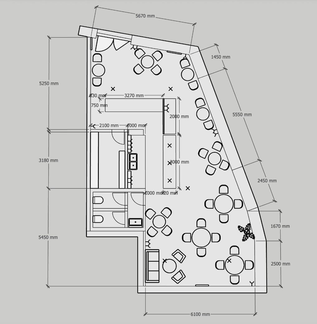 Dispozice prostoru je velký prodejní prostor o výměře přibližně 81 m2, kuchyňka 7 m2 a WC.