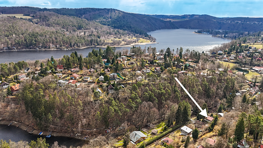 Chata je na opravdu velmi pěkném místě na východním břehu přehrady jen pár metrů od vody v klidné chatové oblasti se vzrostlými stromy. Z okraje Prahy je dostupná cca za 30 minut autem a dojet je možné až přímo na pozemek chaty. Parkování je tedy možné jak na pozemku, tak i před pozemkem, protože součástí prodeje je nejen samotná chata s vlastní oplocenou zahradou o celkové ploše pozemku 591 m2, ale i podíl na pozemku před chatou, ze kterého vede pěší přístup k vodě.